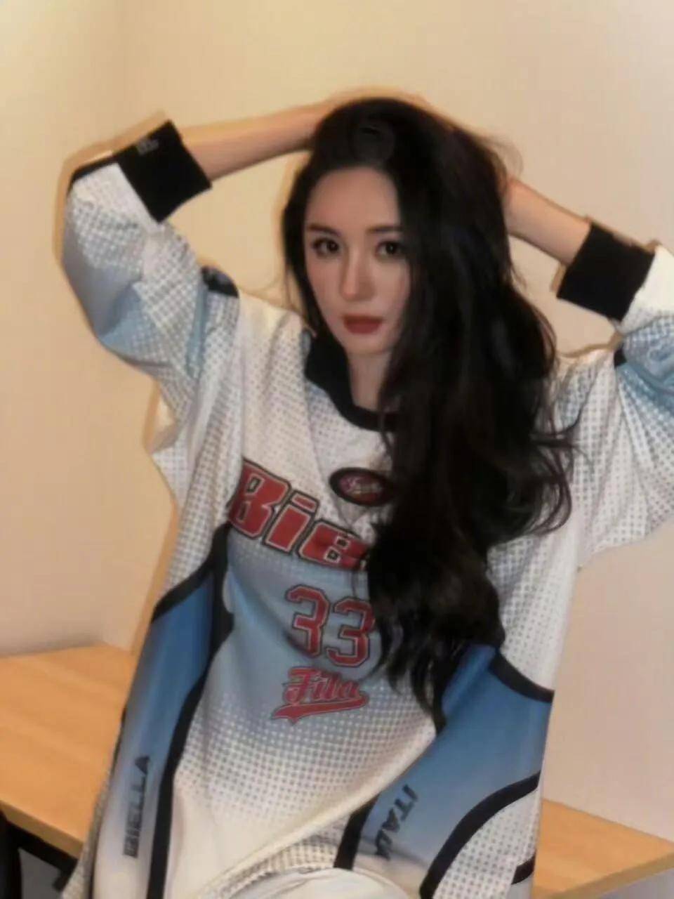 斐乐好会选代言人啊,这身宽大的球衣穿在杨幂身上太好看了,这身千元穿搭被种草了。杨幂挡住脸比耶,她的脸好小巧精致。她把头发披下来,穿球衣的她一下子变得性感迷人,真是百变女郎啊。