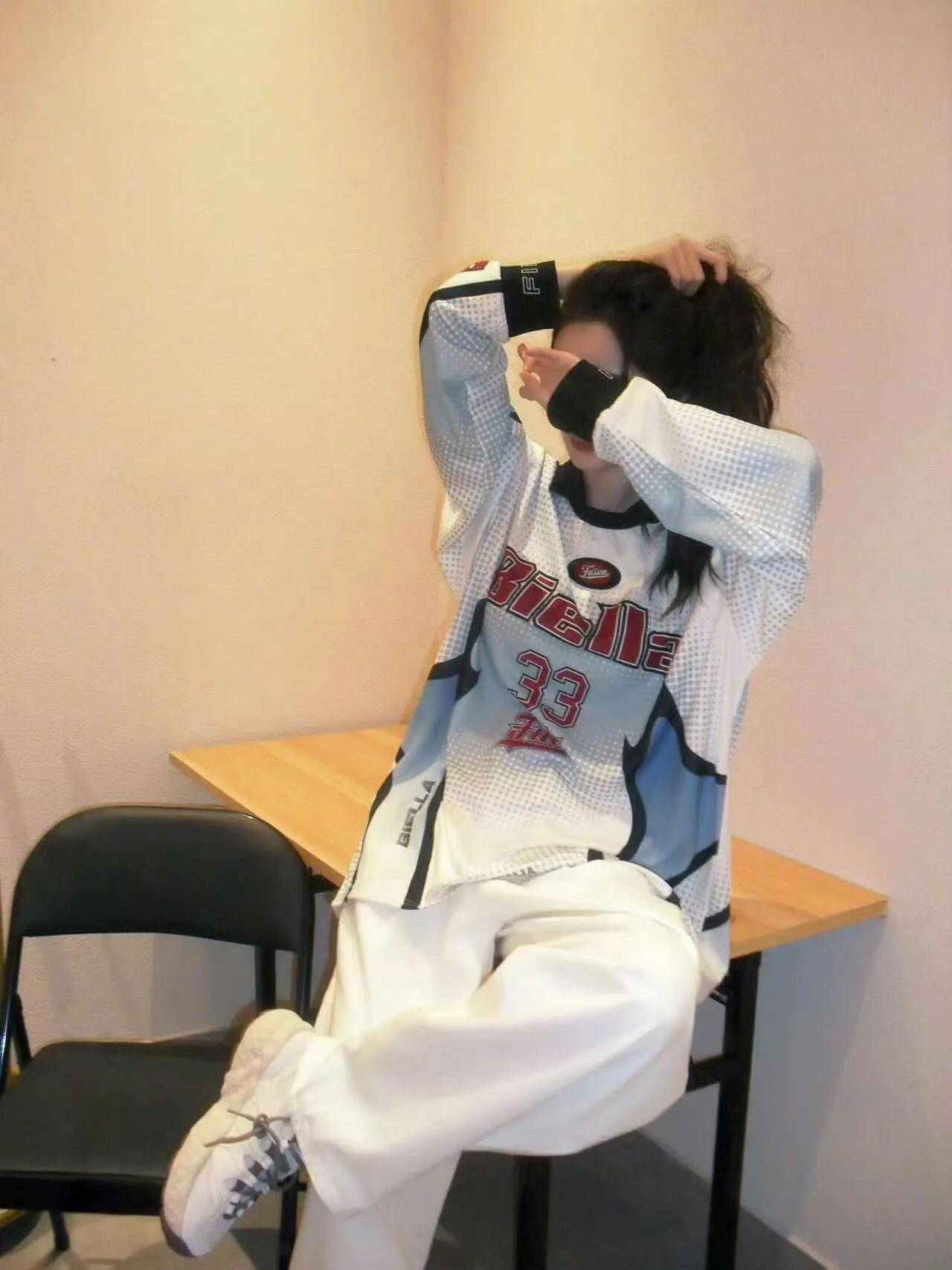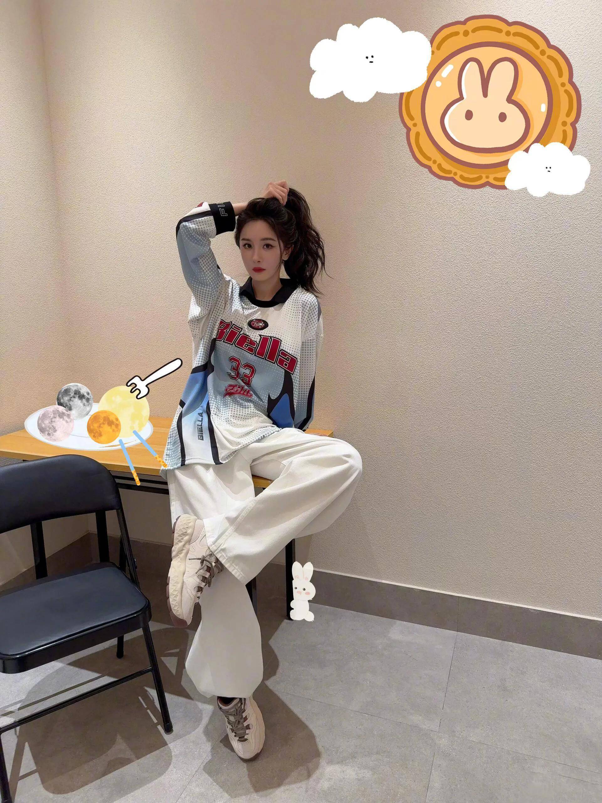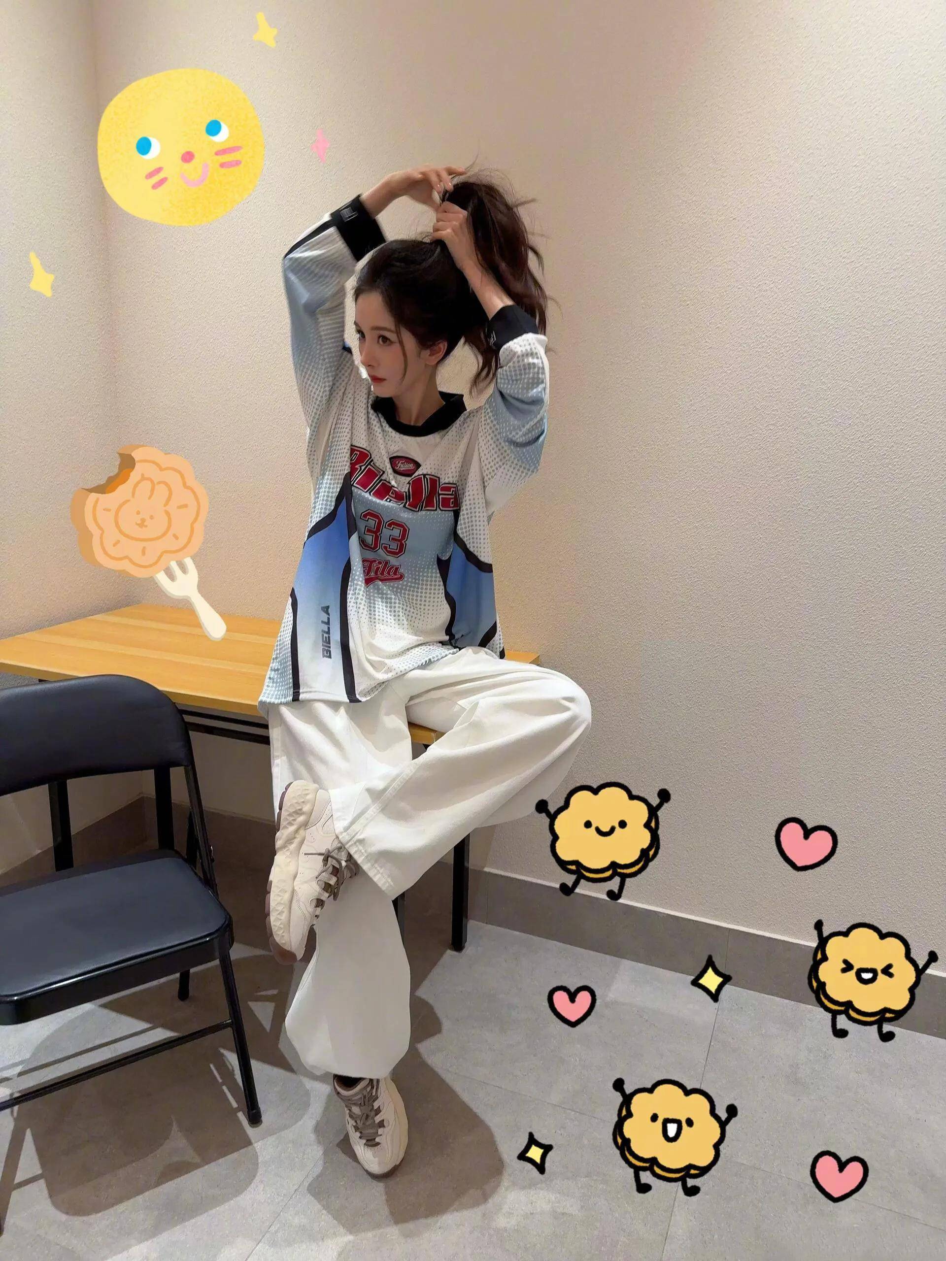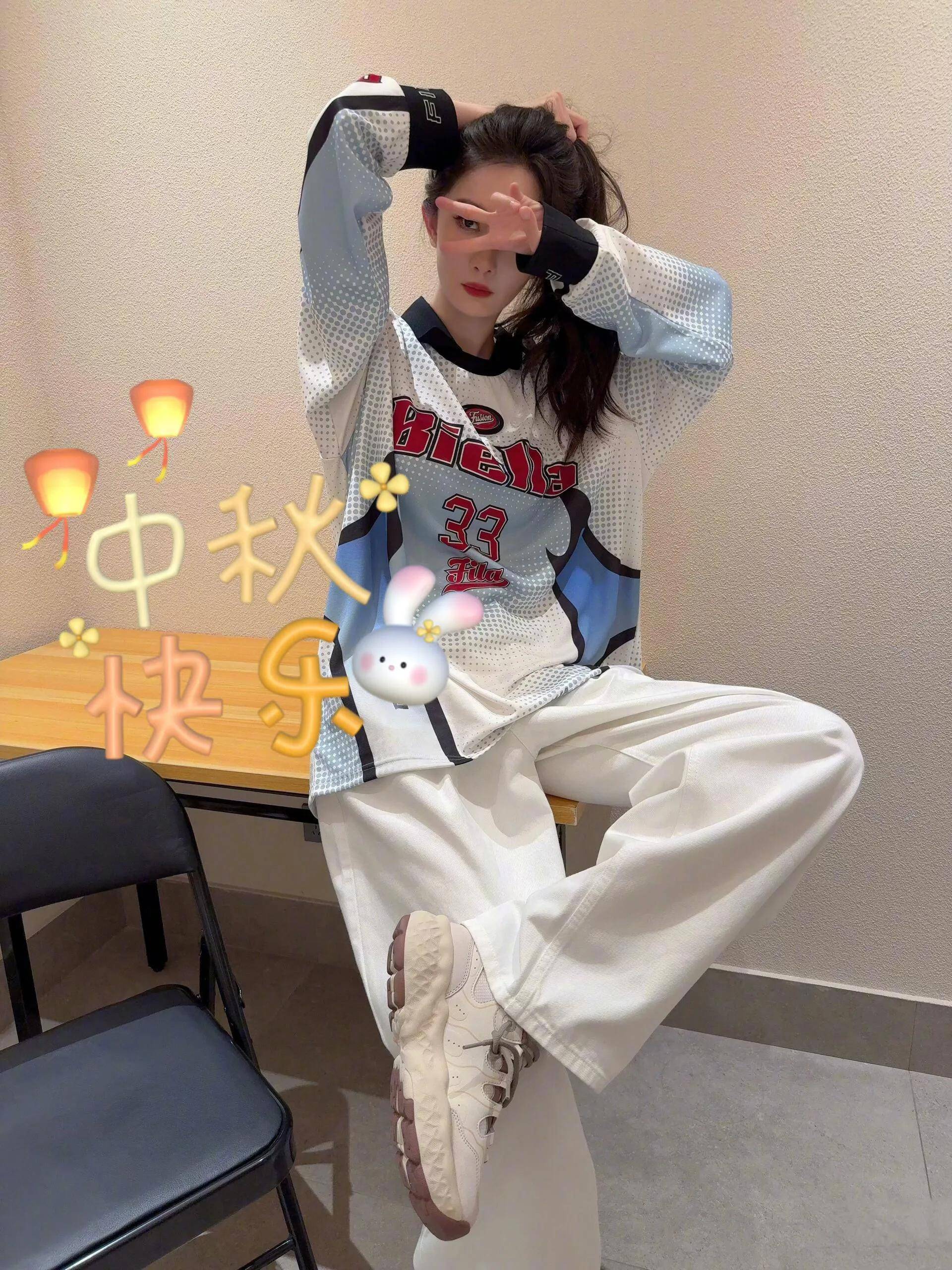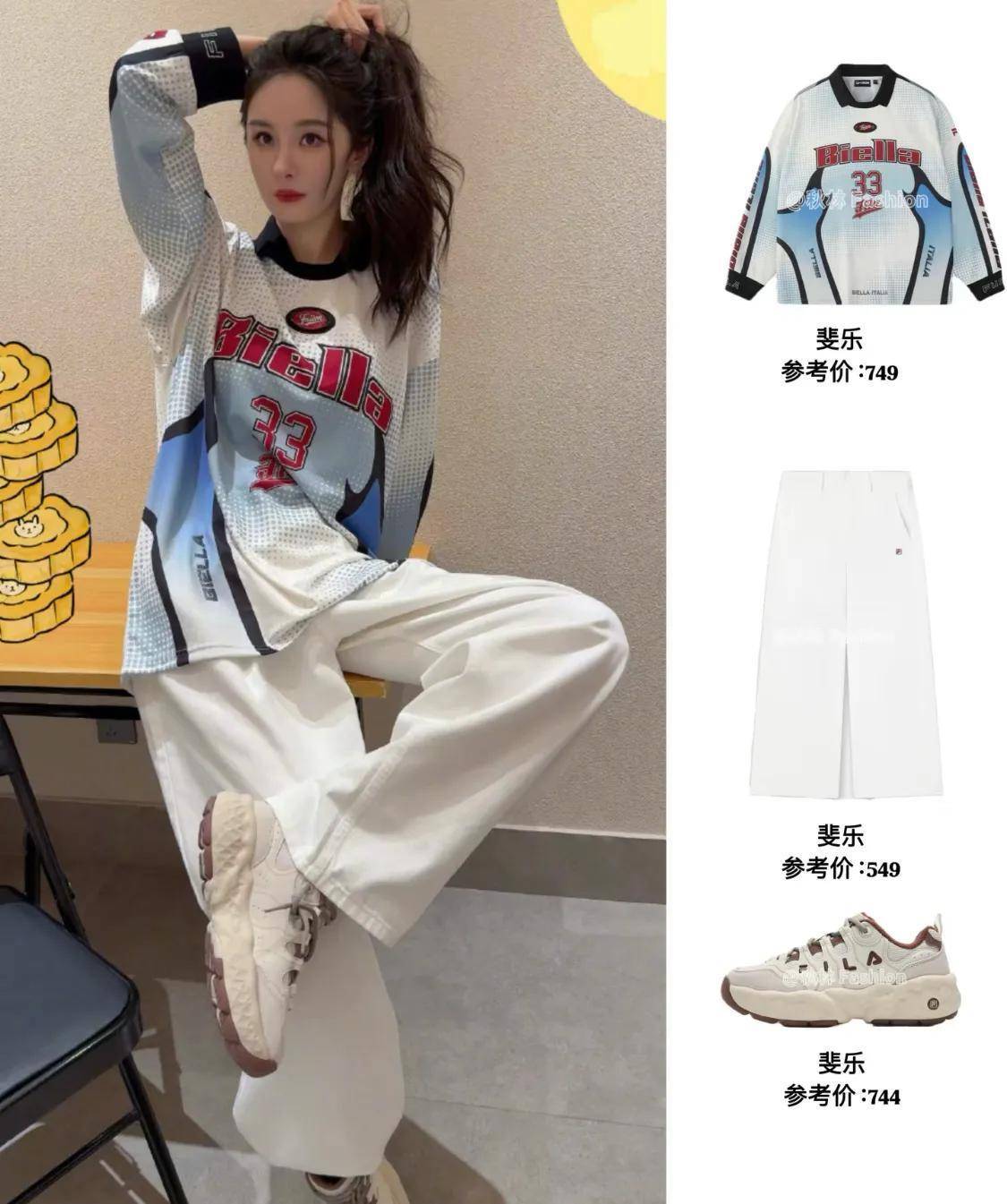 杨幂上身了一套斐乐的运动装,写着“33”的球衣是红蓝配色,颜色热烈又青春。杨幂搭配了斐乐的白色阔腿裤和运动鞋,这身穿搭很像学姐,青春洋溢。她随手抓起卷发,这张脸真漂亮。